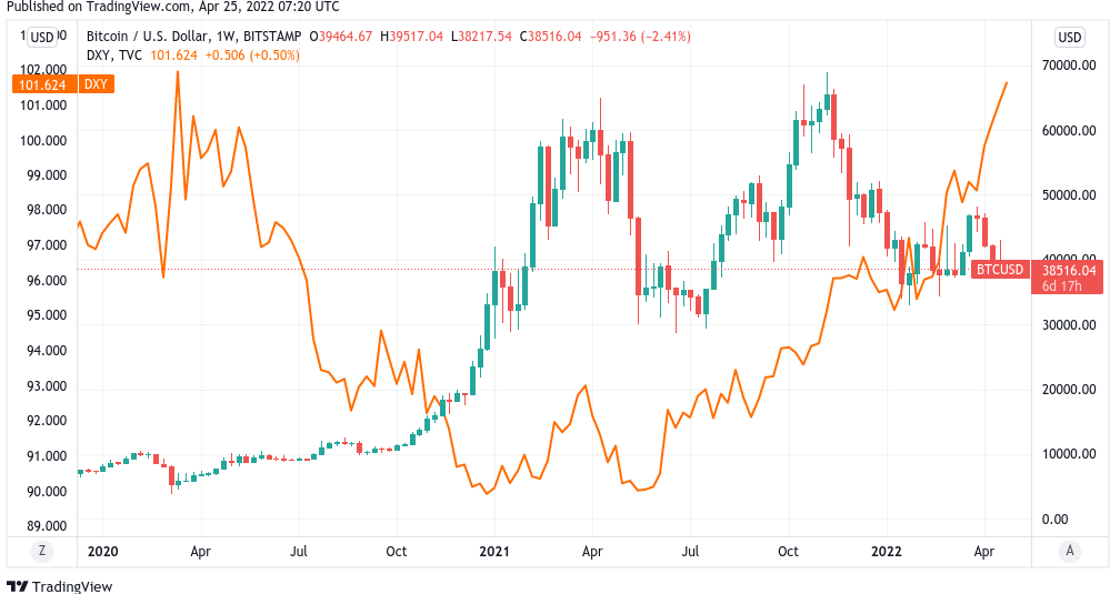 Biểu đồ nến 1 tuần BTC/USD so với chỉ số tiền tệ USD (DXY). Nguồn: TradingView