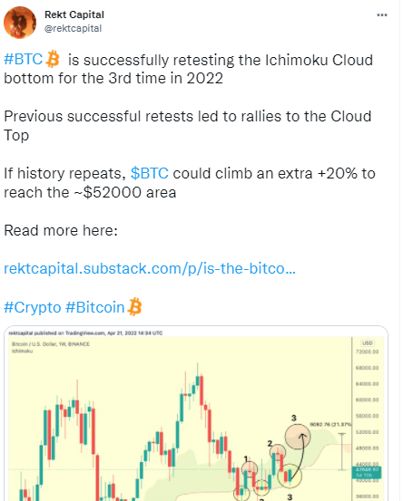 “BTC đang retest thành công đáy của Ichimoku Cloud lần thứ 3 vào năm 2022.