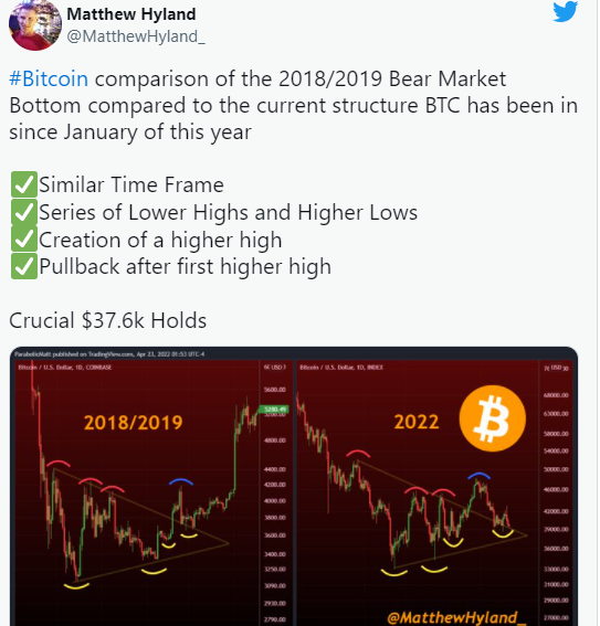 Về chủ đề tháng 12/2018 và giá sàn 3.100 USD của BTC, Matthew Hyland, được gọi là Parabolic Matt trên Twitter, đã đưa ra các so sánh sâu hơn giữa giai đoạn đó và hành động giá BTC hiện tại.