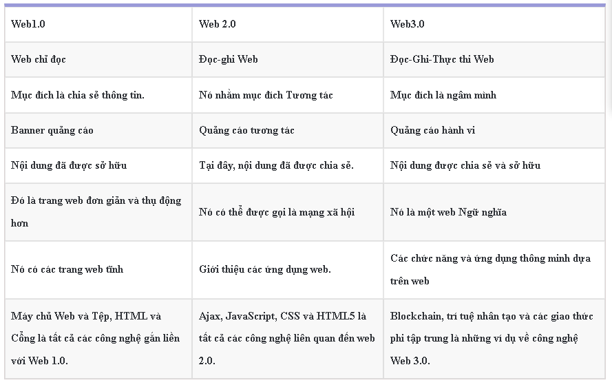 Ba phiên bản của Internet là Web 1.0, Web 2.0 và Web 3.0. Có những khác biệt đáng chú ý trong cách ba thế hệ này tương tác với Internet. Sự khác biệt chính giữa web 1.0, web 2.0 và web 3.0 như sau.