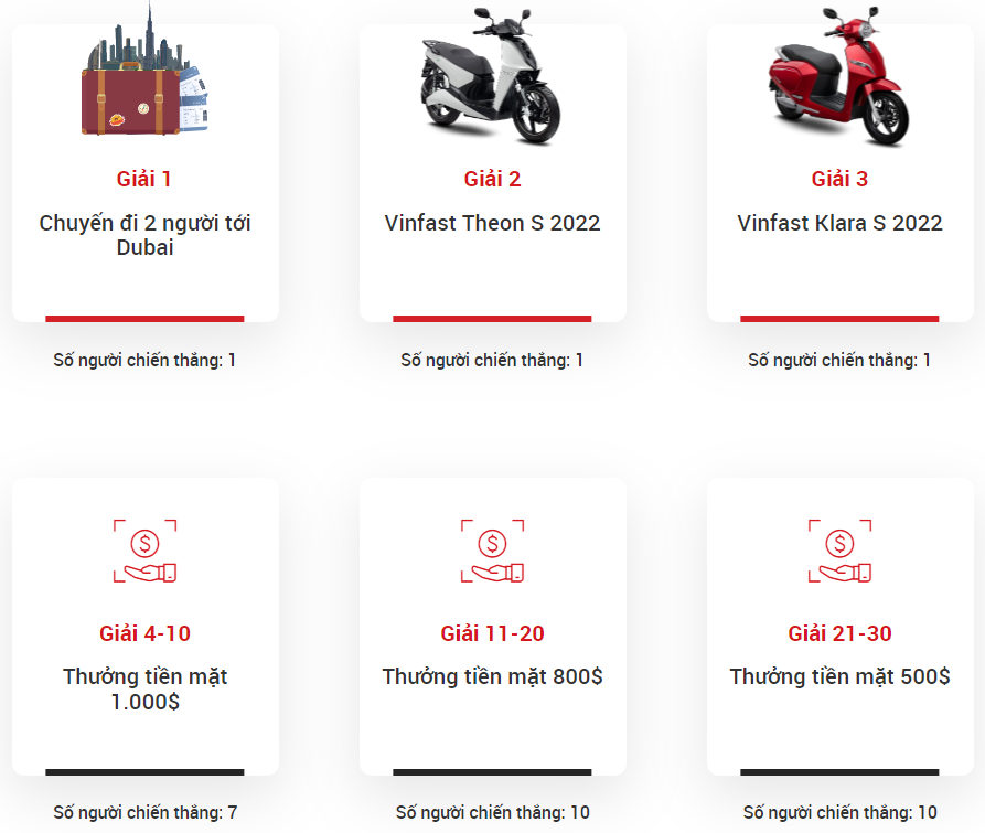 Rút thăm may mắn sẽ có tổng cộng 30 người trúng giải. Giải nhất là chuyến du lịch Dubai dành cho 2 người, giải nhì là xe Vinfast Theon S 2022 và giải ba là xe Vinfast Klara S 2022. Những người chiến thắng còn lại sẽ nhận được các giải thưởng bằng tiền mặt, được cộng trực tiếp vào tài khoản giao dịch của họ. Tất cả khách hàng từ Việt Nam cũng sẽ nhận được thưởng nạp tiền 50% lên đến 500$.*