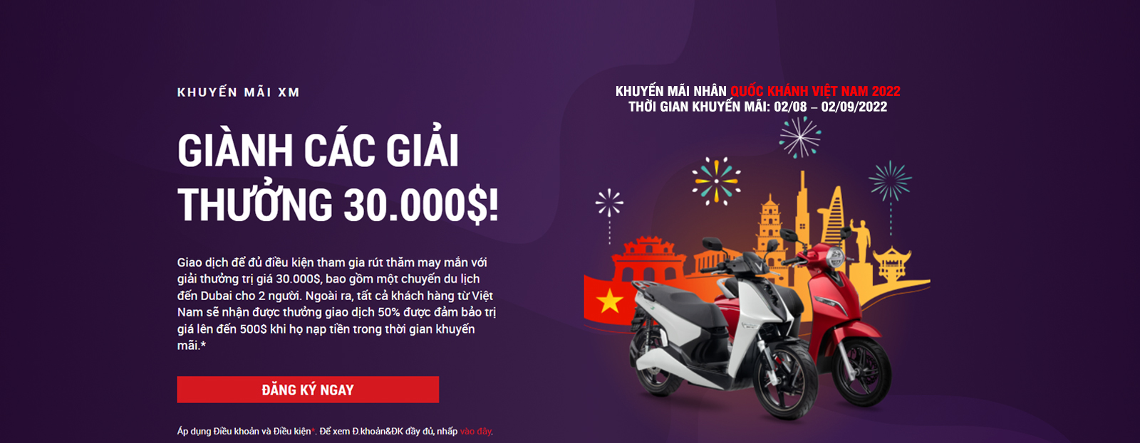 Chương trình khuyến mãi nhân Ngày Quốc khánh Việt Nam 2022 của chúng tôi dành cho tất cả các khách hàng XM hiện tại và mới có (các) tài khoản giao dịch thực XM đã được xác thực cư trú tại Việt Nam.